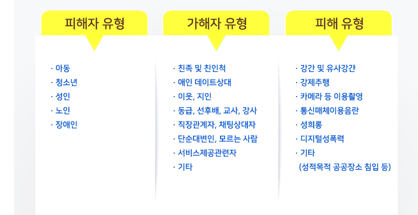 성폭력은 상대방의 의사에 반하여 가하는 모든 성적행위로 신체적·언어적·정신적폭력을 포괄하며 성적자기결정권을 침해하는 모든 행위를 말합니다.